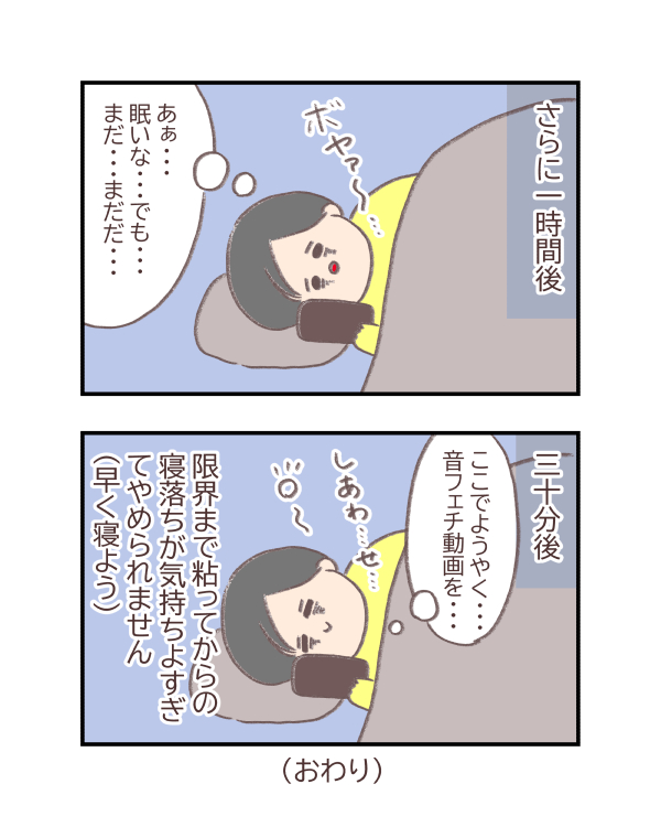昔から寝つきが悪くて、布団に入ってから寝入るまで2時間とか掛かってしまうので何もせずに布団でぼーっとするのが無理過ぎて・・・