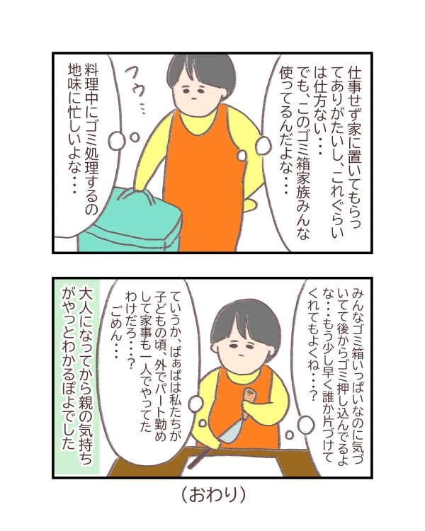 手が空いてる時に気づいた誰かがやってくれよ・・・と思いつつ、家に一番長くいるの私だもんな・・・え、待って、当時外で働いた上でこれも全部母が・・・?と忙しなく考える平日の夕方。