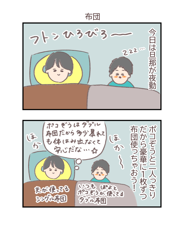 子供に広い布団かけたはずなのに、いつの間にか自分がかけてたシングルの狭い布団に子供が入ってきてるのあるあるだよね・・・