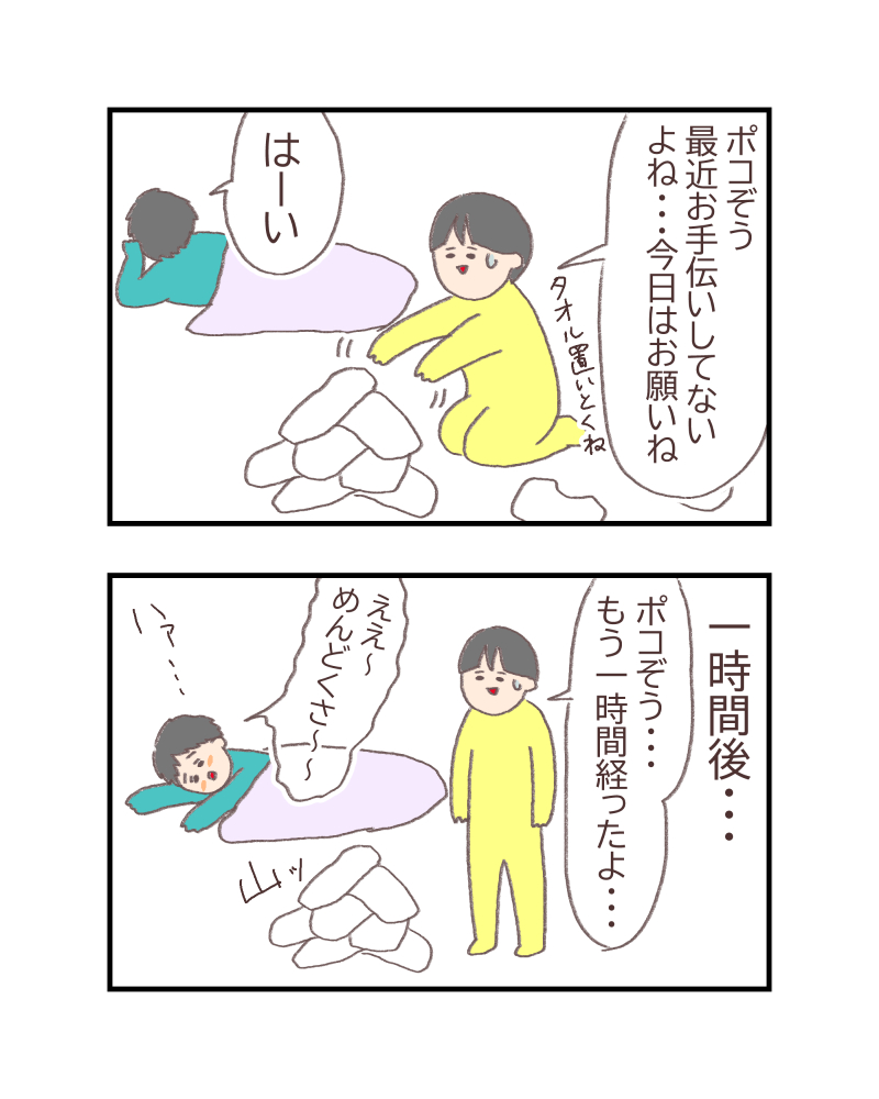 自分が5歳だった頃は毎日たくさんのタオルをたたんだり、お手伝いをコンスタントにしていた記憶がないので、ポコぞうも十分すごいんですよね。