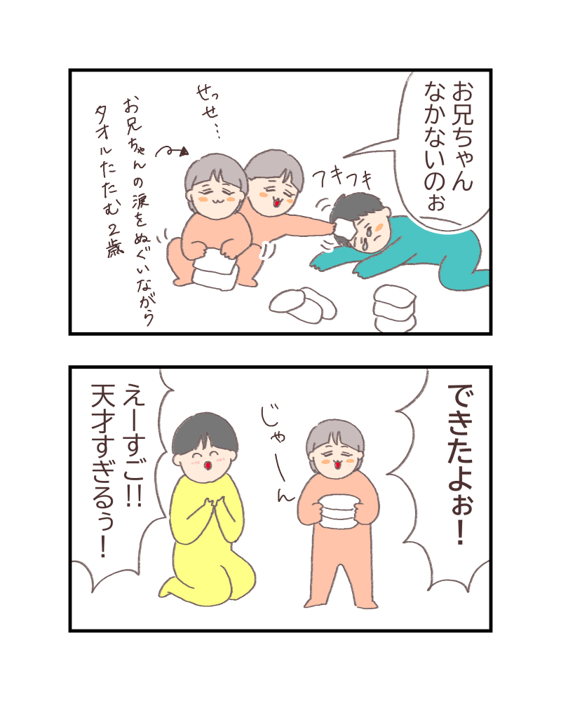 この一件以来、二人は奪い合うようにタオルたたみをしています(笑)