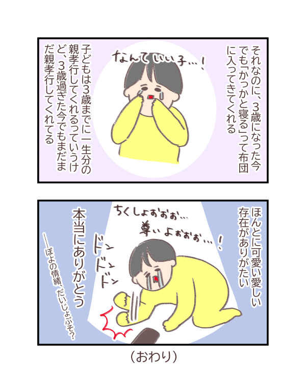 でも、怒っちゃって気まずくなったあとに、この「ごめんね」の時間って大事なのでは・・・?って子供産んでから思います。