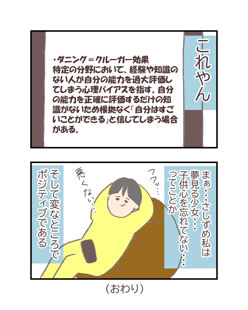 大人になるとある程度いろんな経験をするから変な自信に満ち溢れる瞬間って子供の頃より少なくなると思うんだけど、実は私未だに謎の自信に満ち溢れる瞬間結構あってだな。(子供)
