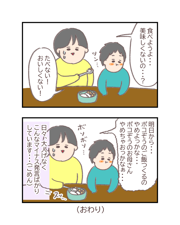 自分の心に余裕がないと、「あんたの作る飯まずいから食べません」って言われた気がしてどんどんネガティブな感情になるときがあるんですよね・・・