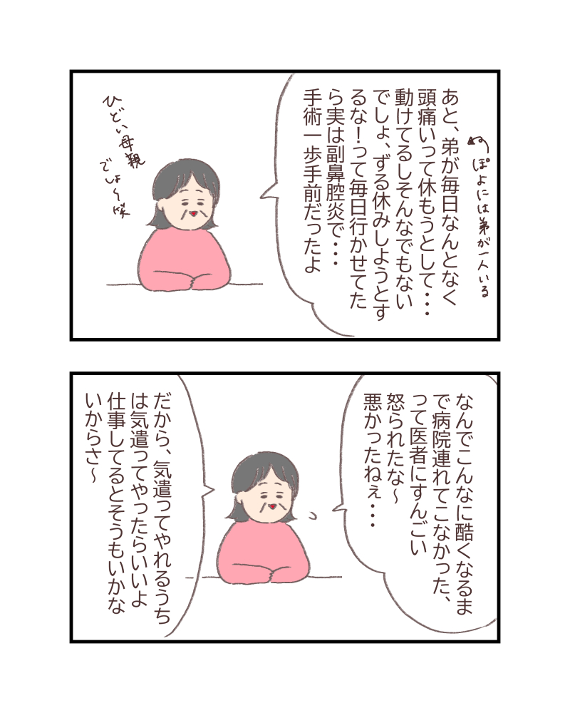 そんな中で母親は家計のために一生懸命働いていたので(もちろん父もです!)、子供の多少の体調不良ではそう簡単に休めなかったのは想像がつきます。