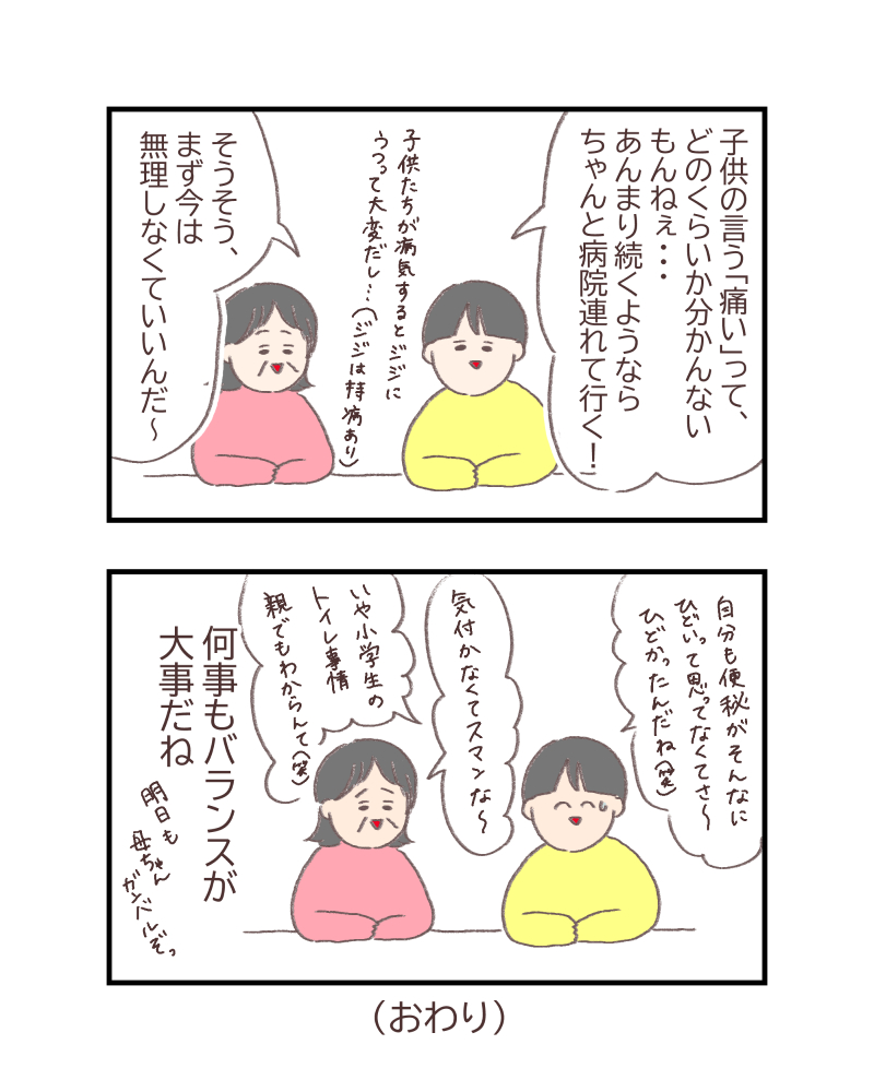 なので、ちょっと無理して登校させられたことを恨んじゃいないし、仕方なかっただろうってわかってはいるんですが、やっぱり子供の体調不良には寄り添ってあげられるなら寄り添ってあげたいよなって再認識させられました。