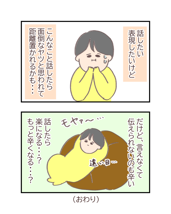 逆に、このモヤモヤくよくよを話して引かれることがツラい。