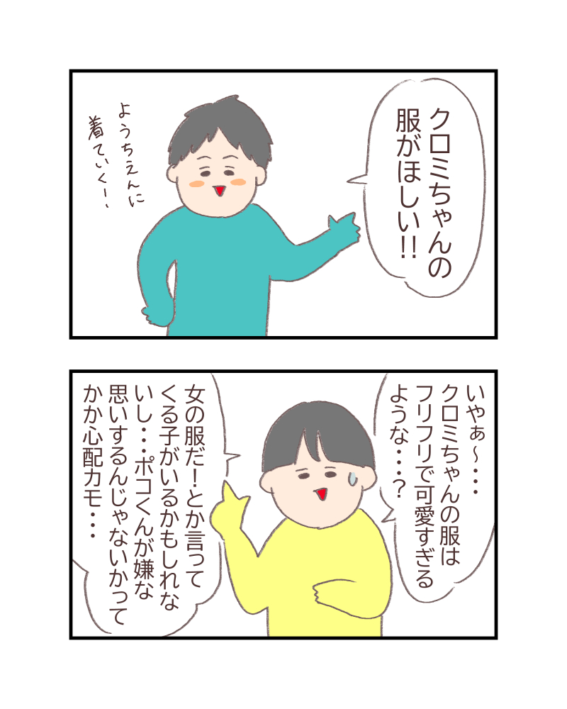男だからとか、女だからとかいう以前に、フリフリレースのついた服は幼稚園や小学校に向かないデザインなのでは・・という思いもあったり。