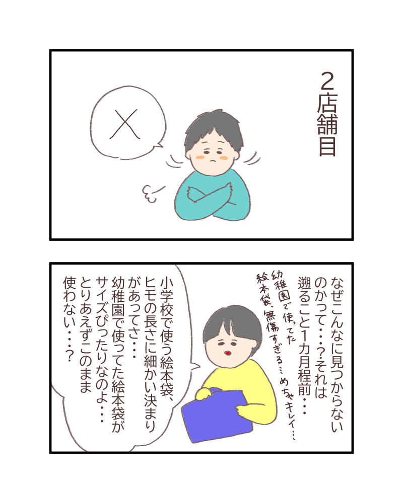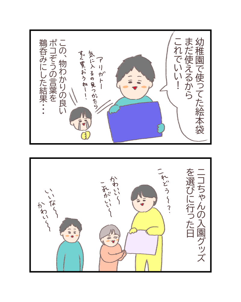 その条件に合うものを探すのが大変だったりして、絵本袋に関しては幼稚園で使っていたものがサイズぴったりだったので継続で使おうという案を聞き入れてもらったんですね。