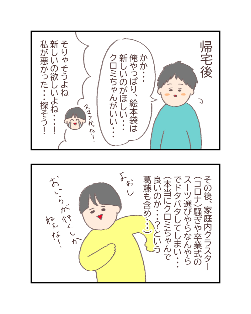 そんなこんなで結局、本人が欲しがるデザイン(クロミちゃん)の絵本袋を探す旅に出ることに・・・