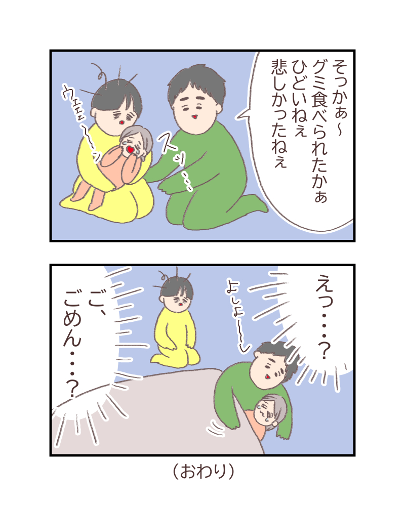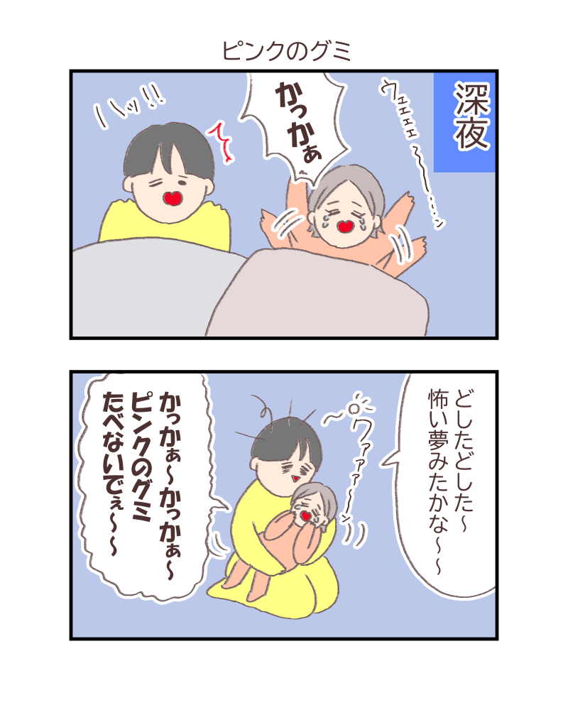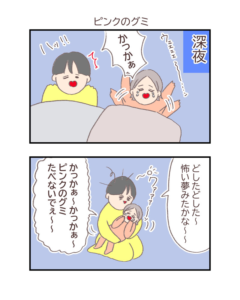 でもこの日は私にピンクのグミ食べられたことがよっぽどショックだったのか、夫と一緒にスッと寝ました・・・