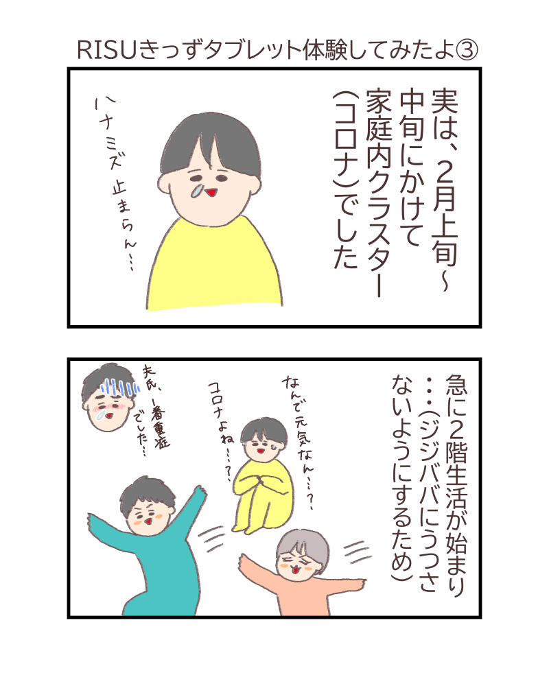 本当は隔離期間(10日程度)もタブレット学習すればよかったのですが、私もほんのり具合が悪く、夫は重症(発熱、倦怠感)、限られた2階スペースの空間で暮らすのでいっぱいいっぱい・・・
