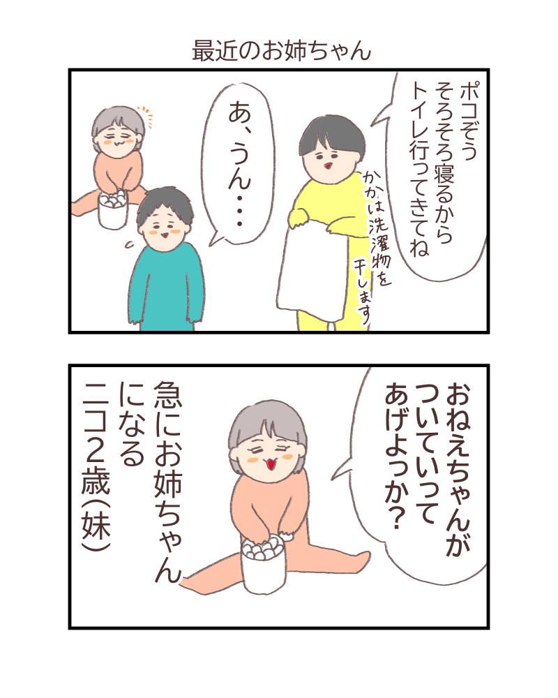 ポコぞうは毎日トイレについて来てもらっているので、ニコちゃんがおもちゃを取りに二階に行きたがった時なんかは率先してついていってあげたりしているようです。
