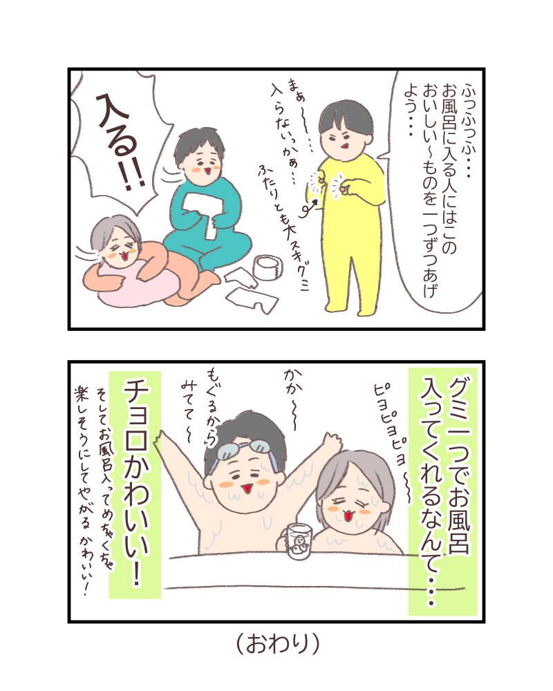 ただ、お風呂が楽しすぎると今度は「まだ上がりたくない!」が始まるので程々に・・・(笑)