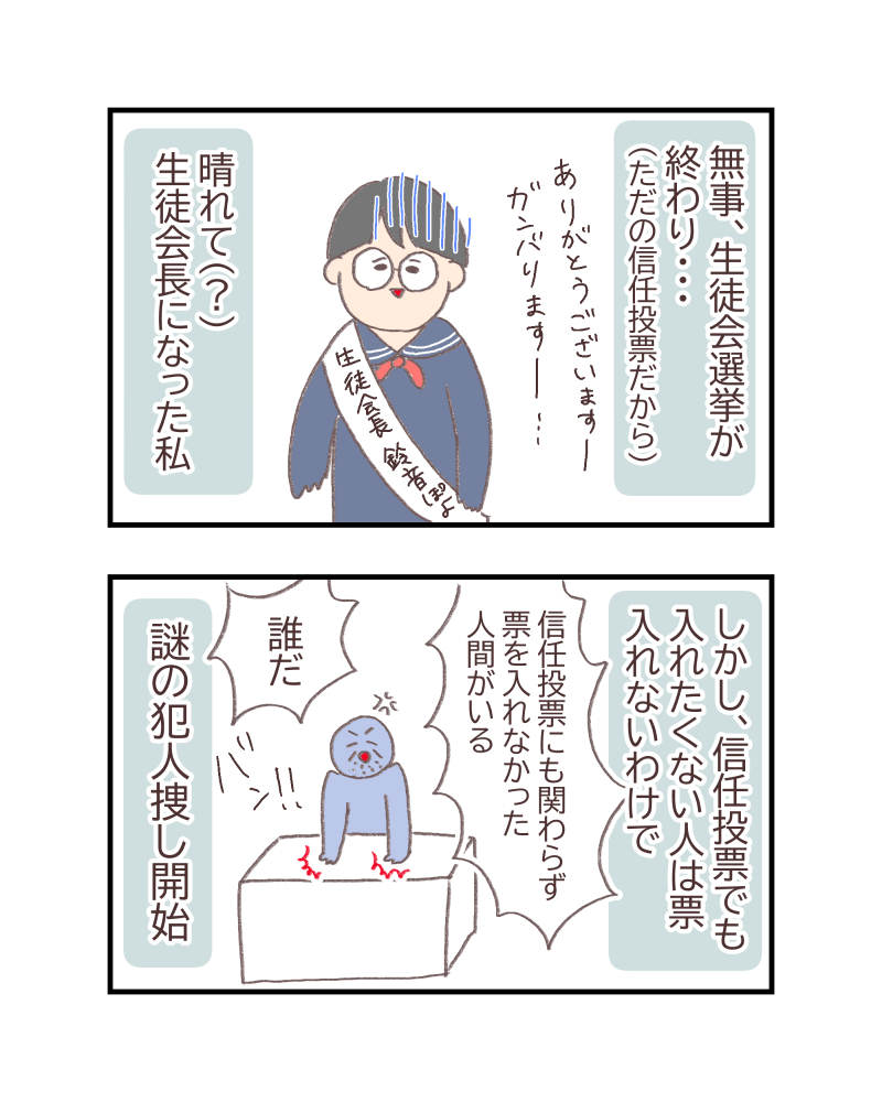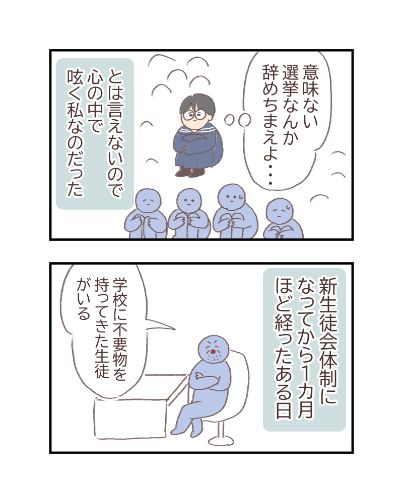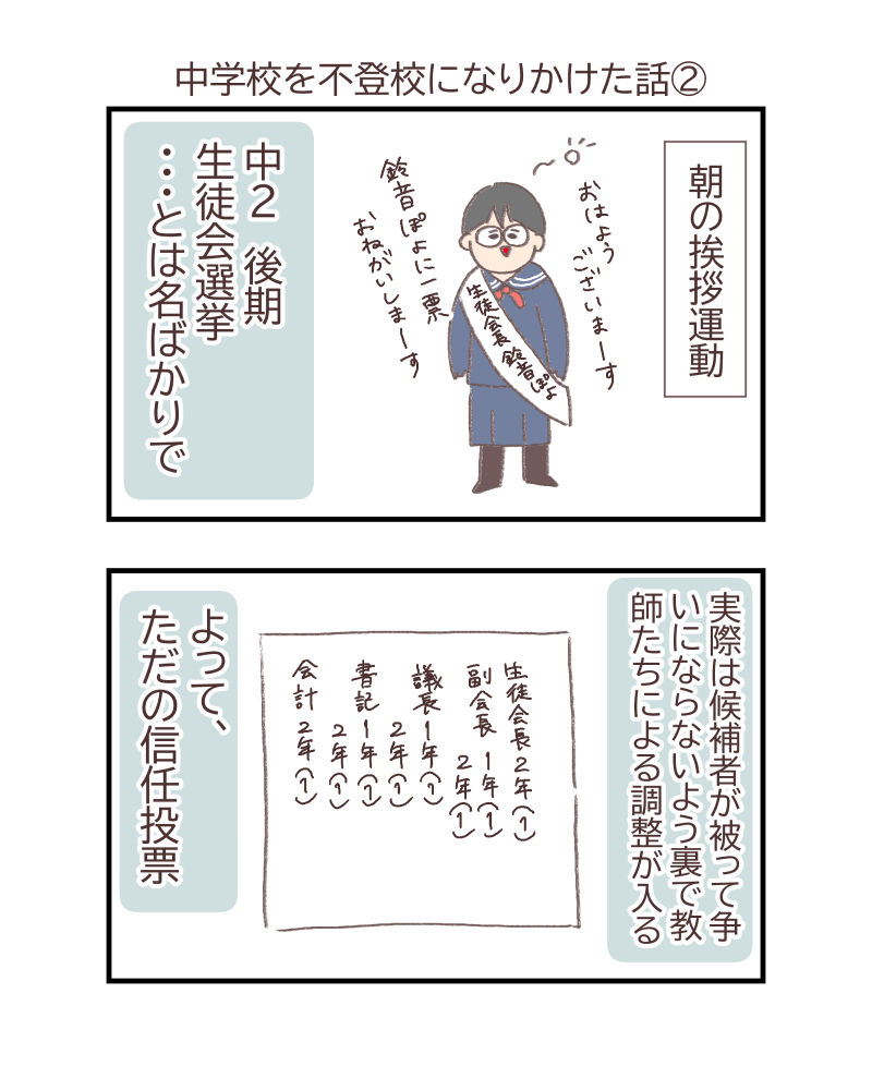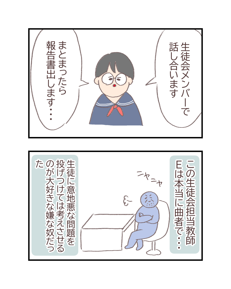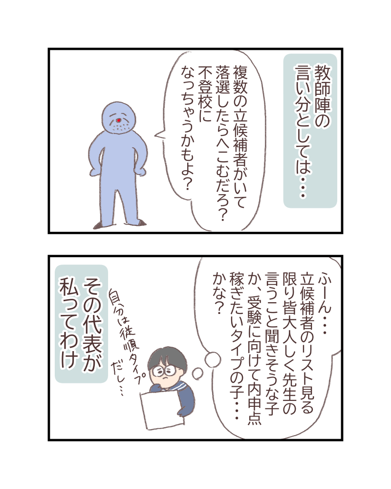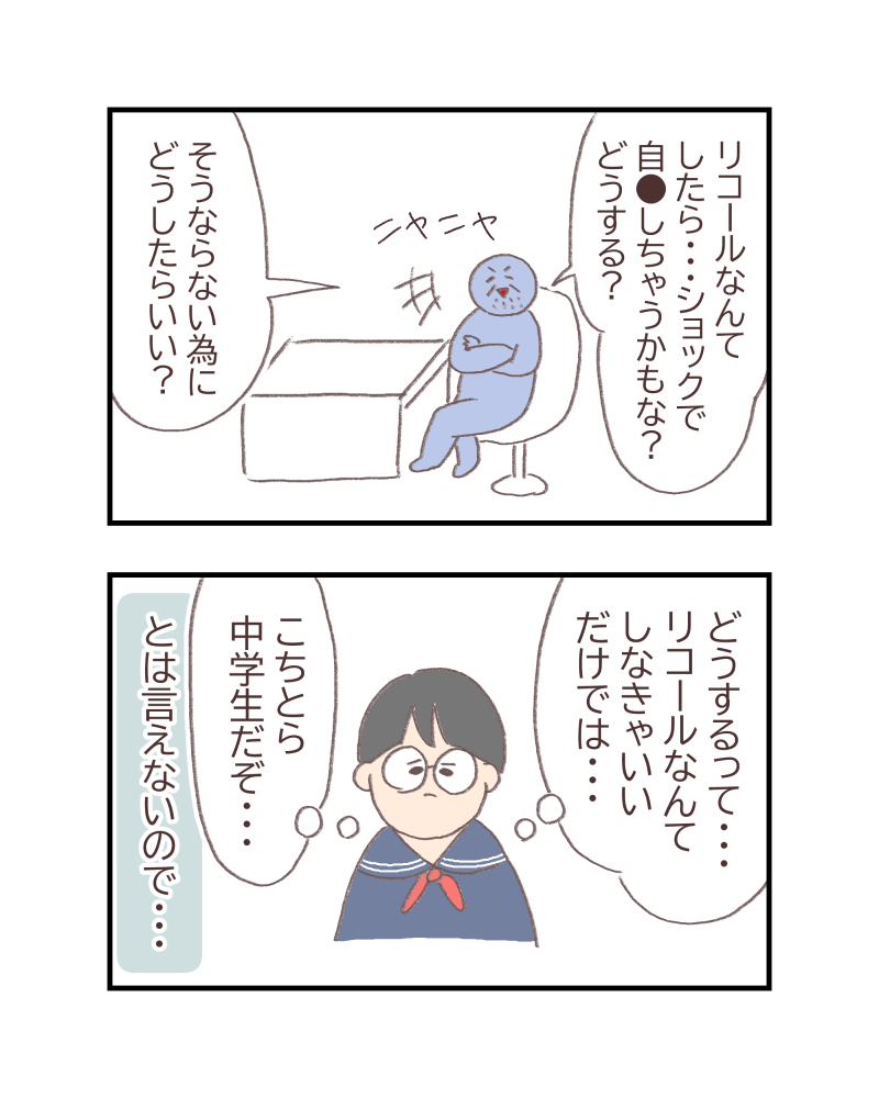 先生的には色々なことを考えさせたかったのかもしれないですが、ニヤニヤしながら「不登校」「リコール」と話す姿を見て、「意地悪されてる」としか思えなかった記憶・・・。
