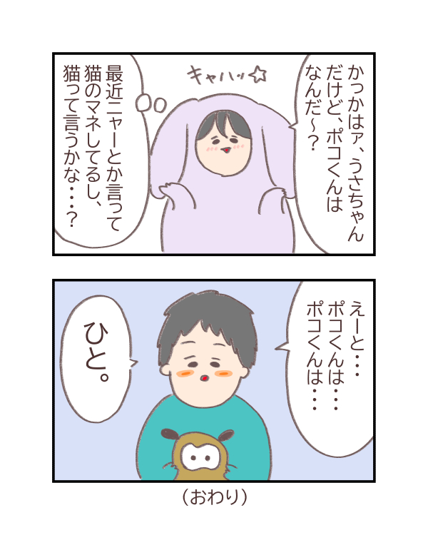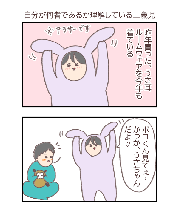 自分が何者であるか理解している二歳児 日常 Twitter Facebook はてブ Pocket LINE コピー 2025.10.22 2025.10.21 ※過去絵日記なので私とポコぞうの年齢にズレあります。 GUで買ったうさみみパジャマ着てはしゃいでたら、急に冷静になったポコぞう。 何回聞いても答えは「ひと」でした。。。 ぽよ 正解!! よろしければポチッとお願いします にほんブログ村 人気ブログランキング